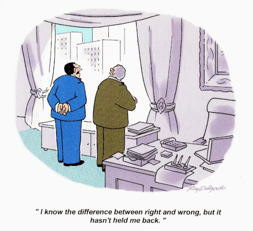 Take some examples. Everyone has a right to a decent standard of living, but a responsibility to uphold the law in the pursuit of this. Businesses have a right to make profits, but a responsibility not to exploit its workers, consumers or the environment.
