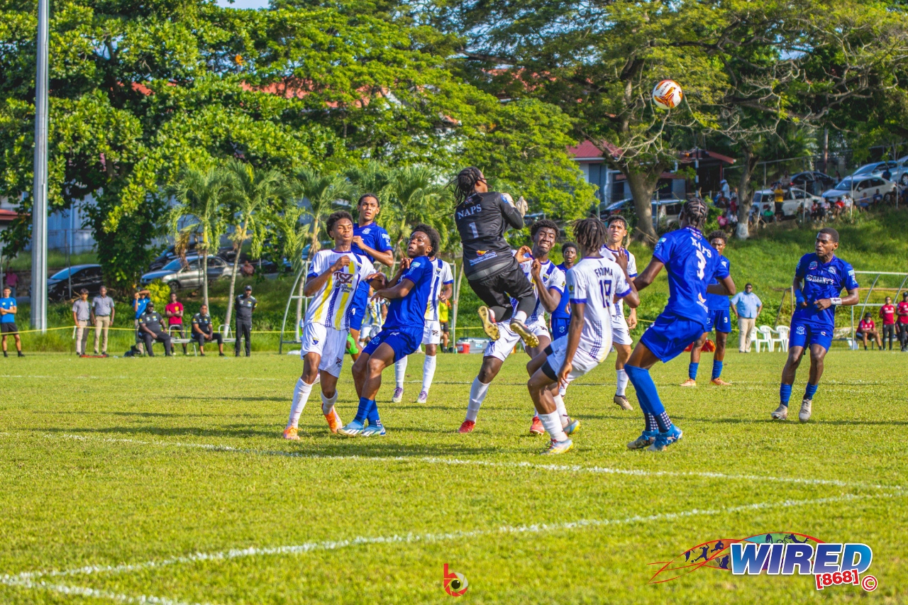 Fatima players appealed for an offside decision against Naparima substitute Riquelme Phillips in the buildup, but the visitors still got two chances to clear the ball and missed both—before Rodriguez nodded over the goal line.