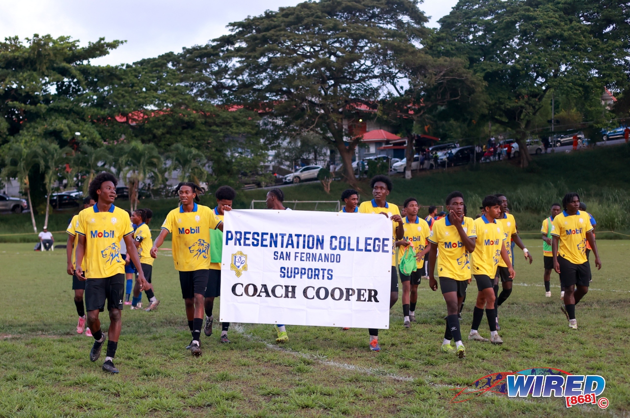At the final whistle, a group of Presentation College players ran onto the field bearing a banner that pledged support for suspended coach Shawn Cooper, who remains sidelined by Trinidad and Tobago Football Association (TTFA) safeguarding chief Gary St Rose.