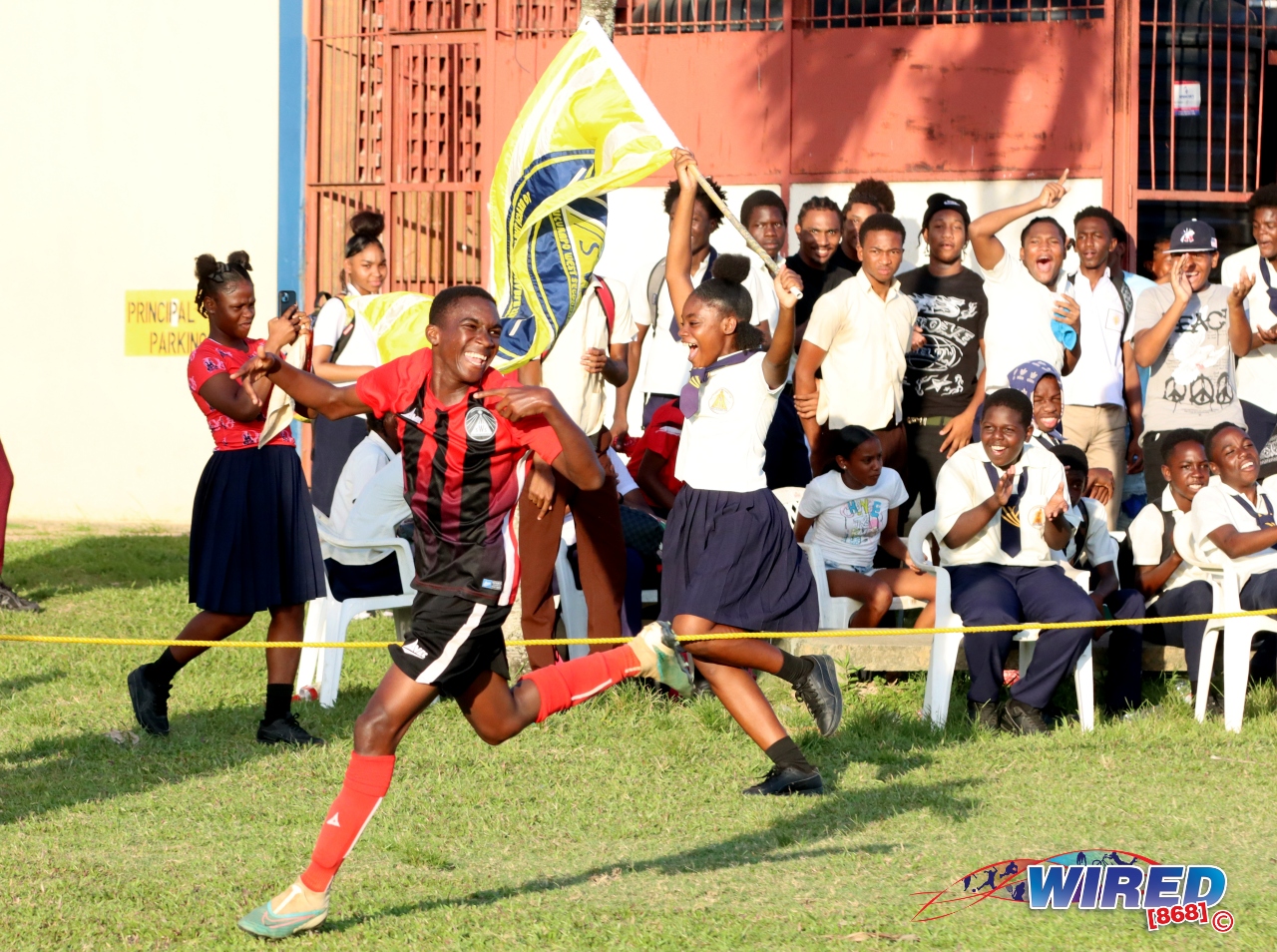 Mucurapo West Secondary forward Caleb Jacob celebrates his goal against Palo Seco Secondary in front of his fellow students during First Citizens Big Five action at Mucurapo on 29 October 2025.