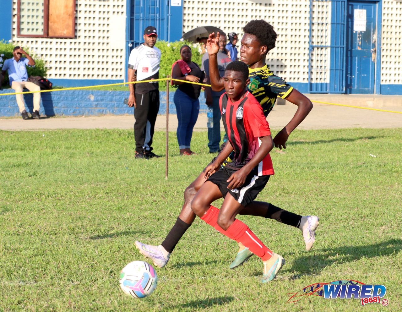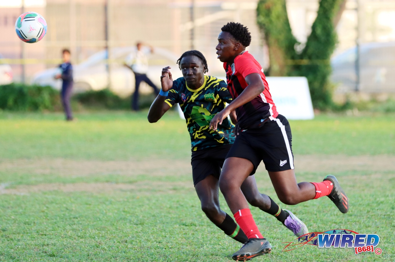 Mucurapo West Secondary attacker Tavon Hamilton (right) takes on Palo Seco Secondary defender Kashaun Phillip during First Citizens Big Five action at Mucurapo on 29 October 2025.