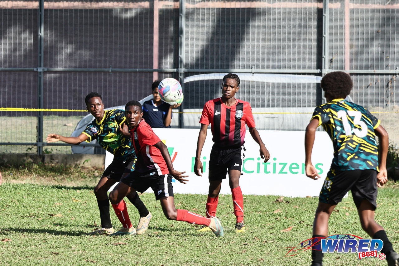 Mucurapo West Secondary forward Caleb Jacob (second from left) prepares to receive the ball during First Citizens Big Five action against Palo Seco Secondary at Mucurapo on 29 October 2025.