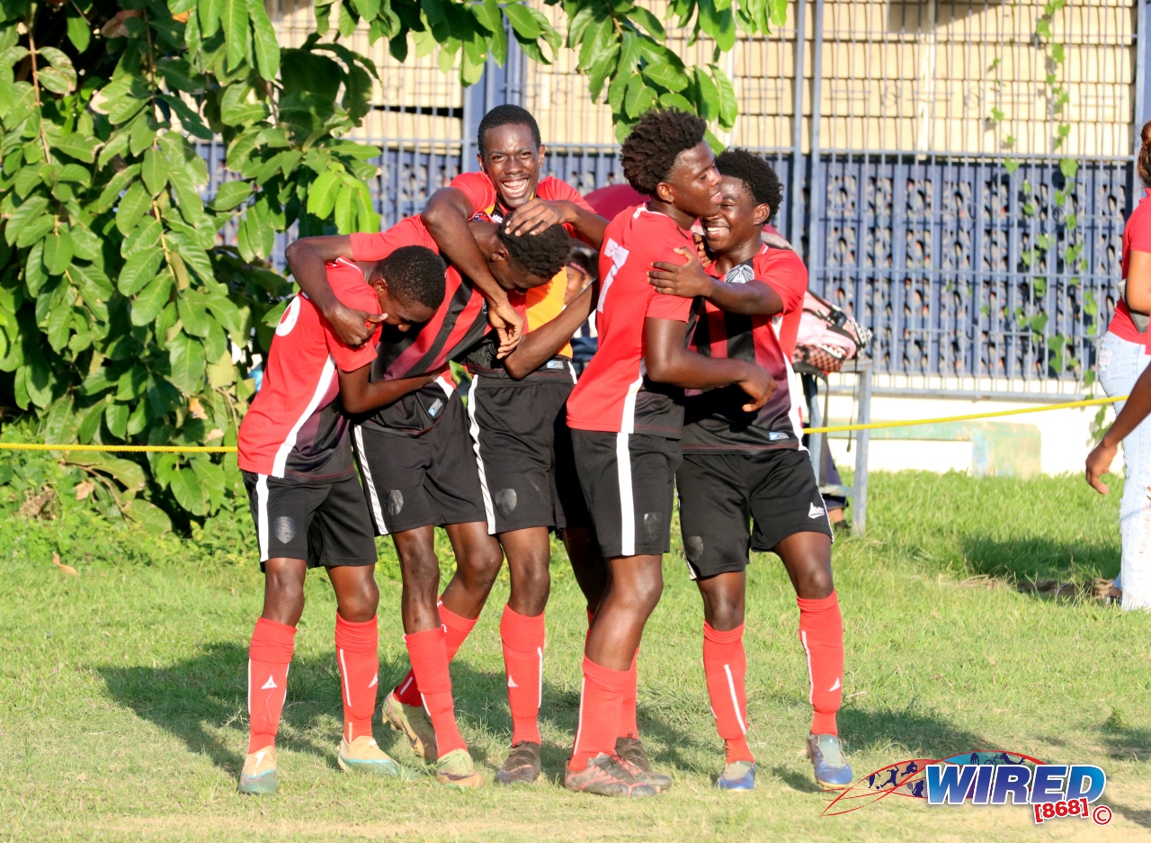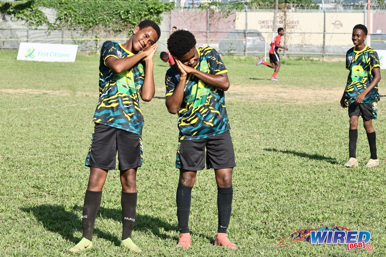 Palo Seco Secondary attackers Ezekiel Garcia (left) and Jeremiah Fermin celebrate Garcia’s early goal against Mucurapo West Secondary during First Citizens Big Five action at Mucurapo on 29 October 2025.