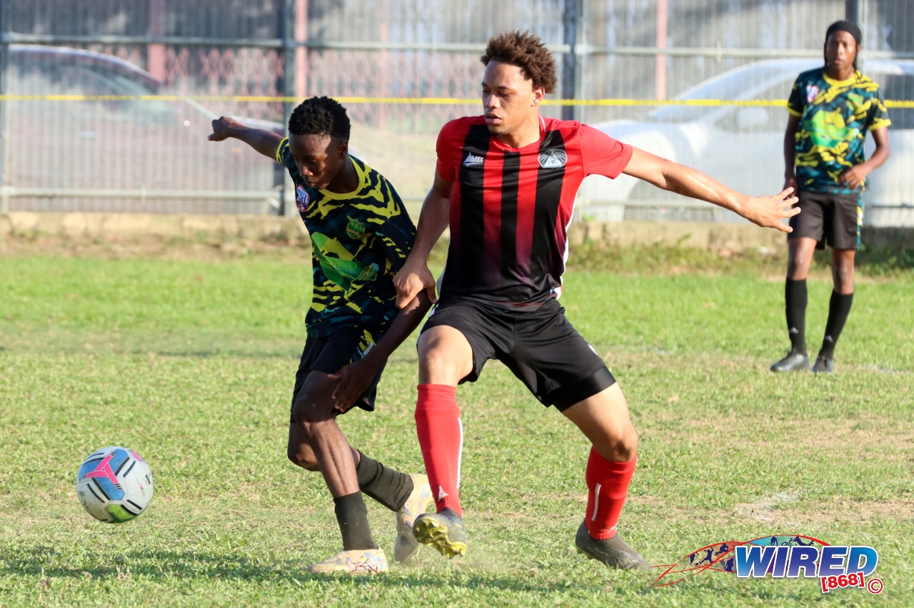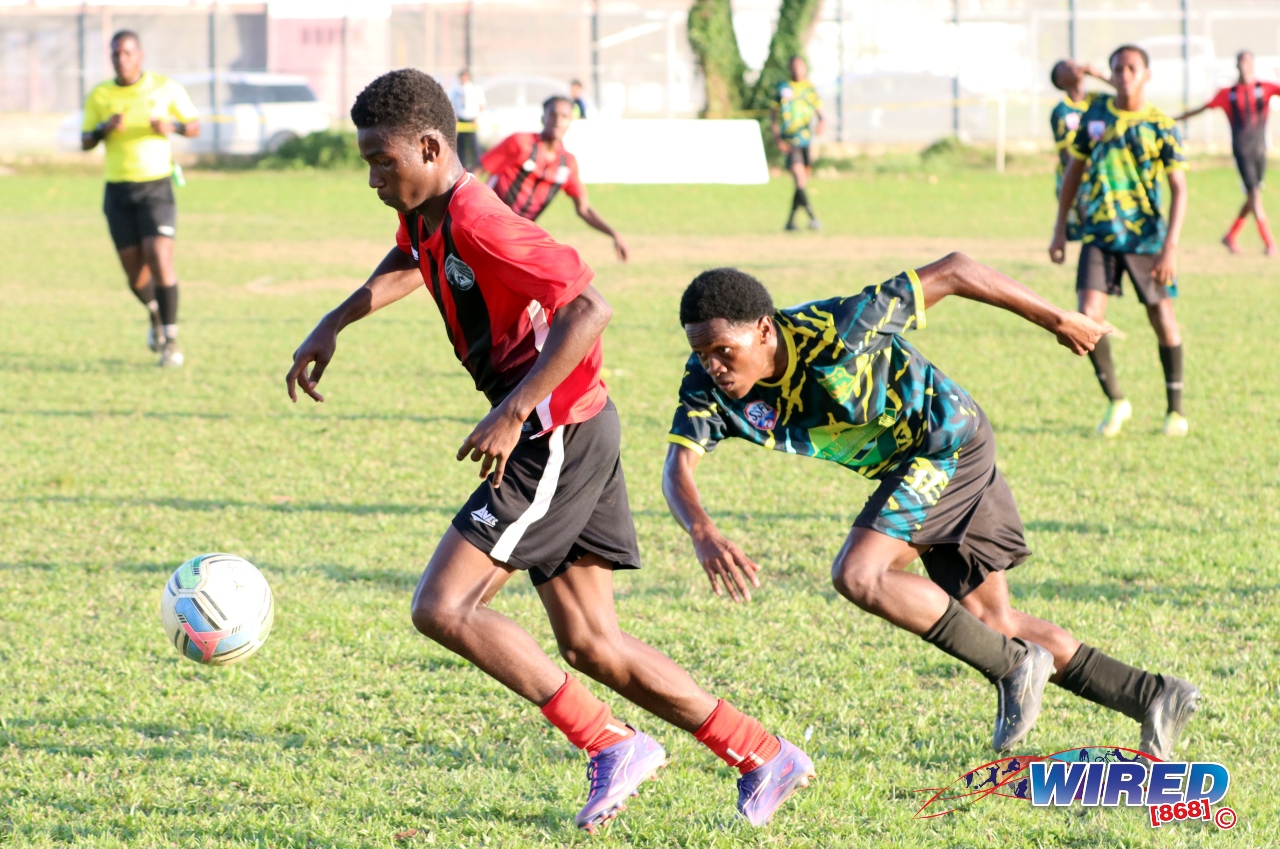 Palo Seco Secondary attacker Rashied John-Williams (foreground) tries to keep the ball from Mucurapo West Secondary defender Nazim Skinner during First Citizens Big Five action at Mucurapo on 29 October 2025.