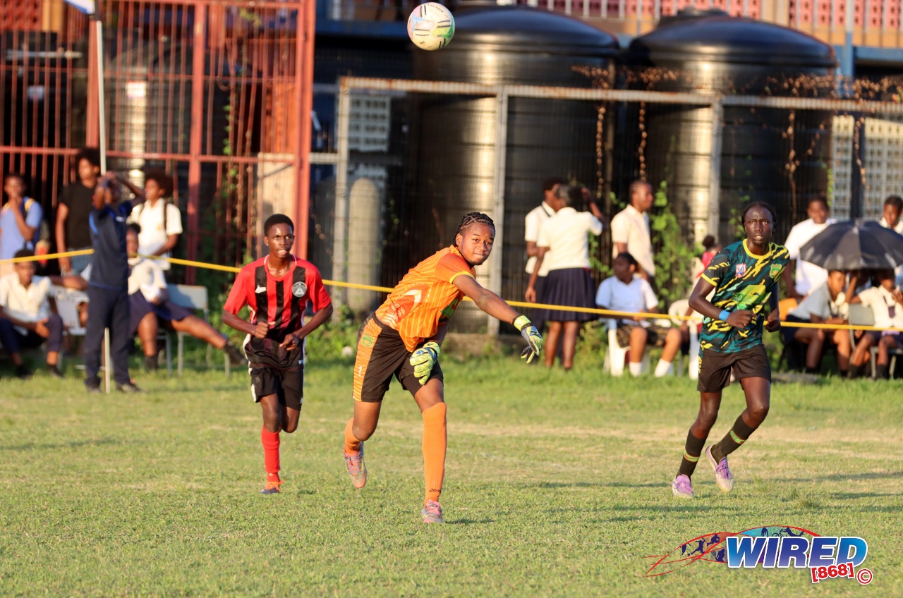 Palo Seco Secondary goalkeeper and captain Kristan Woods (centre) attempts to initiate an attack for his school during First Citizens Big Five action against Mucurapo West Secondary at Mucurapo on 29 October 2025.